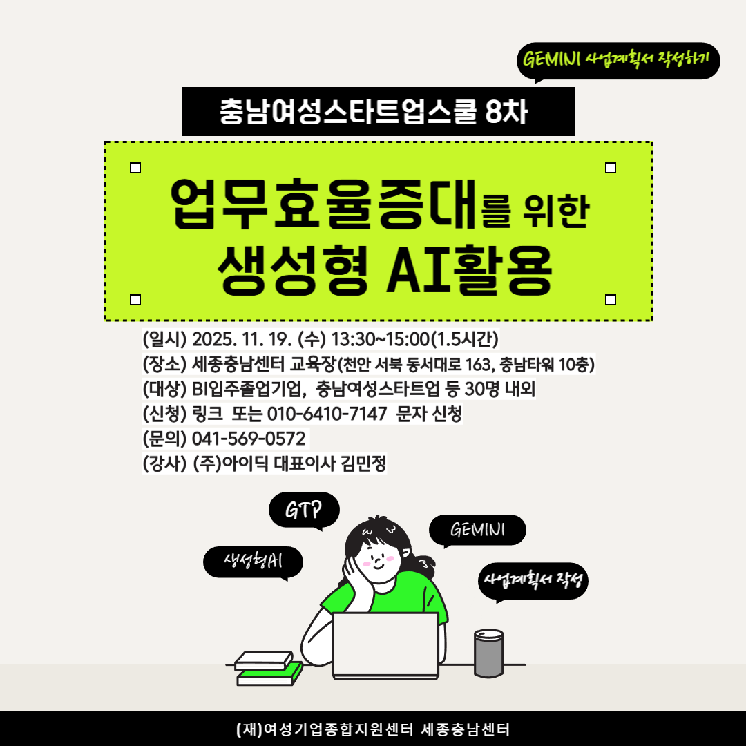 제8차 충남여성스타트업스쿨 참가 안내(업무효율을 높이는 생성형AI활용)