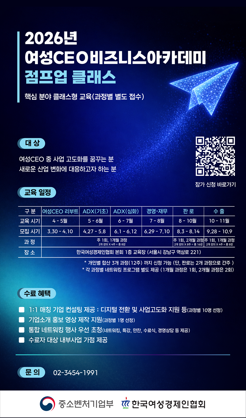 ※ 참가 신청 및 자세한 사항은 「2026년 여성CEO 점프업 클래스」 홈페이지( https://www.kwbiz.or.kr/academy/main )에서 확인하실 수 있습니다.