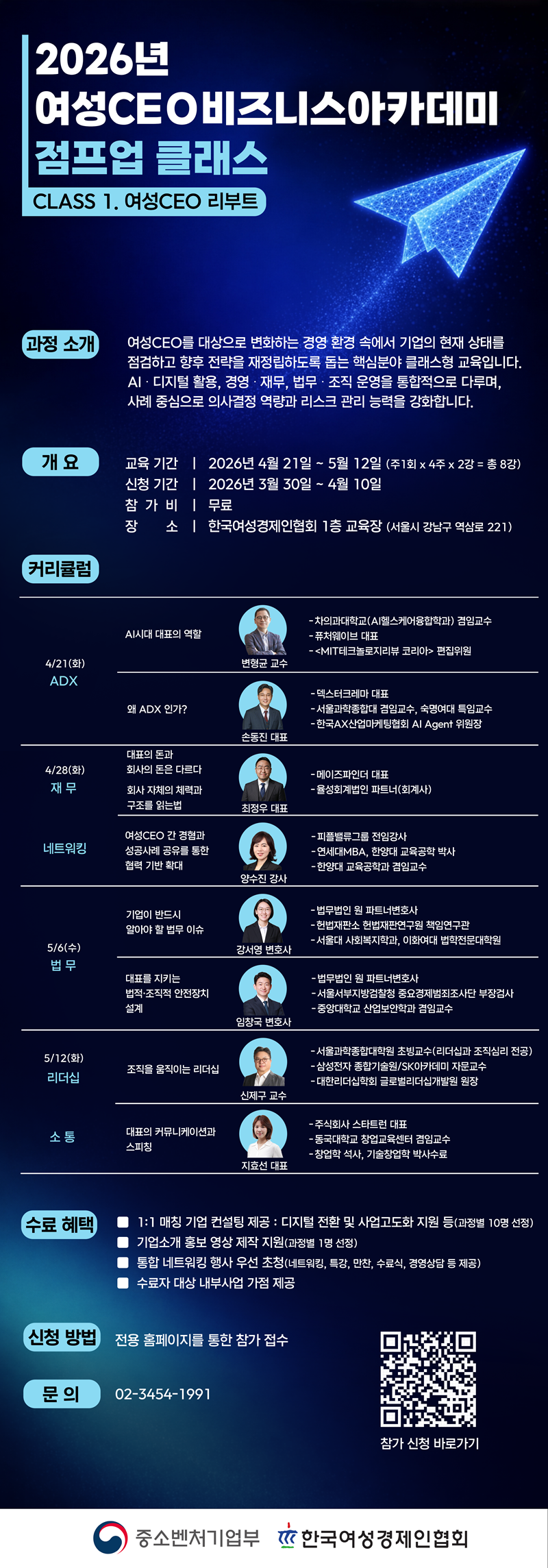 한국여성경제인협회에서 「2026년 여성CEO 점프업 클래스」 여성CEO 리부트 과정 참가자를 모집합니다.